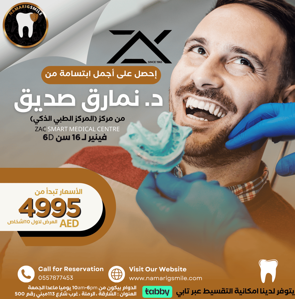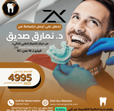 احصل على أجمل ابتسامة مع د. نمارق صديق من مركز (المركز الطبي الذكي) في الشارقة! نقدم فينير لـ 16 سن 6D بأسعار تبدأ من 4995 AED والعرض لأول 10 أشخاص فقط